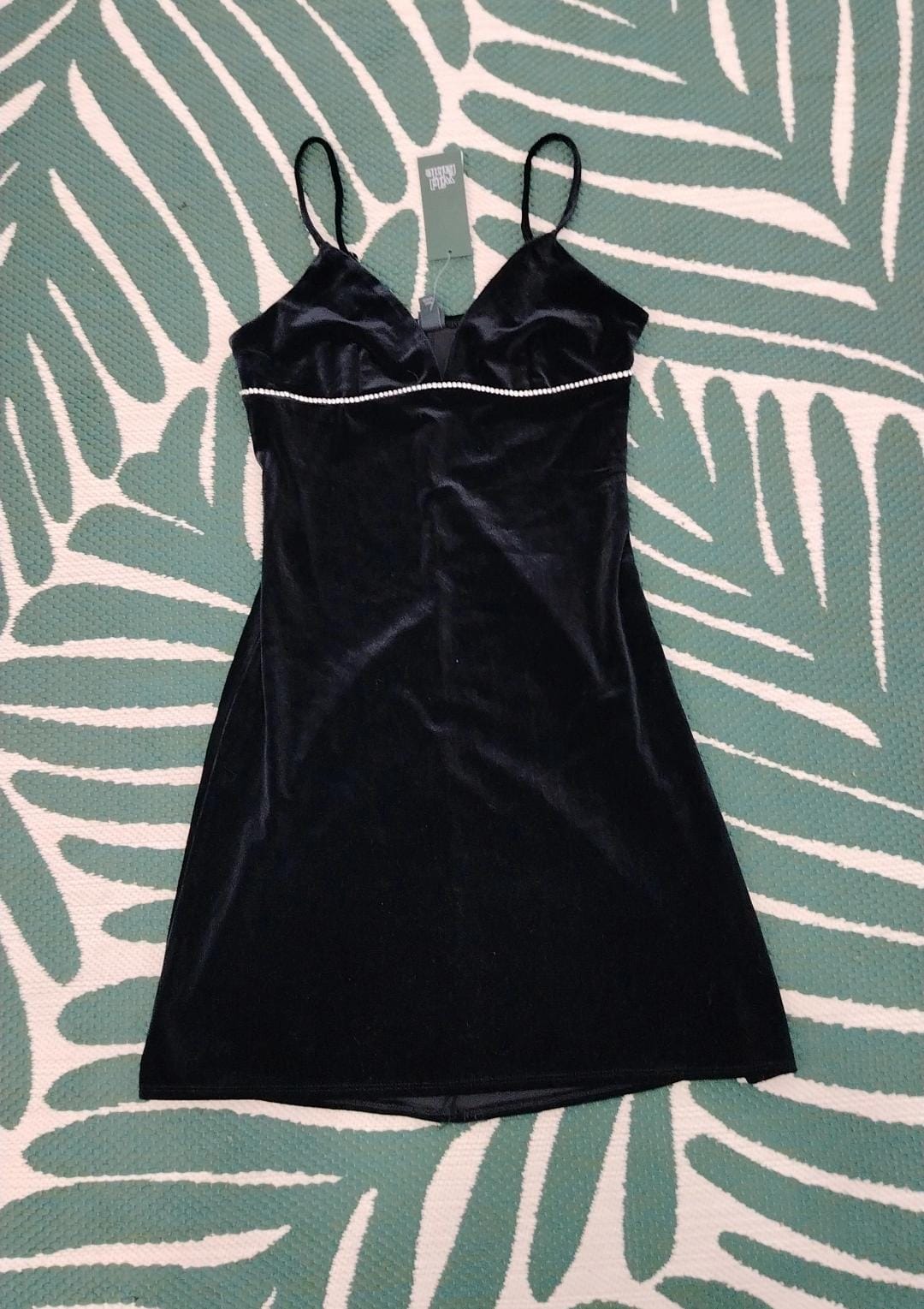 Este vestido de terciopelo negro es una joya atemporal que evoca el glamour de décadas pasadas. Su textura suave y el contraste del detalle blanco en el busto lo convierten en una pieza ideal para ocasiones especiales o noches con estilo. Los tirantes delgados y el escote delicado realzan la feminidad con discreción. Perfecto para quienes buscan un look vintage con elegancia y personalidad, esta prenda es una declaración de estilo por sí sola.